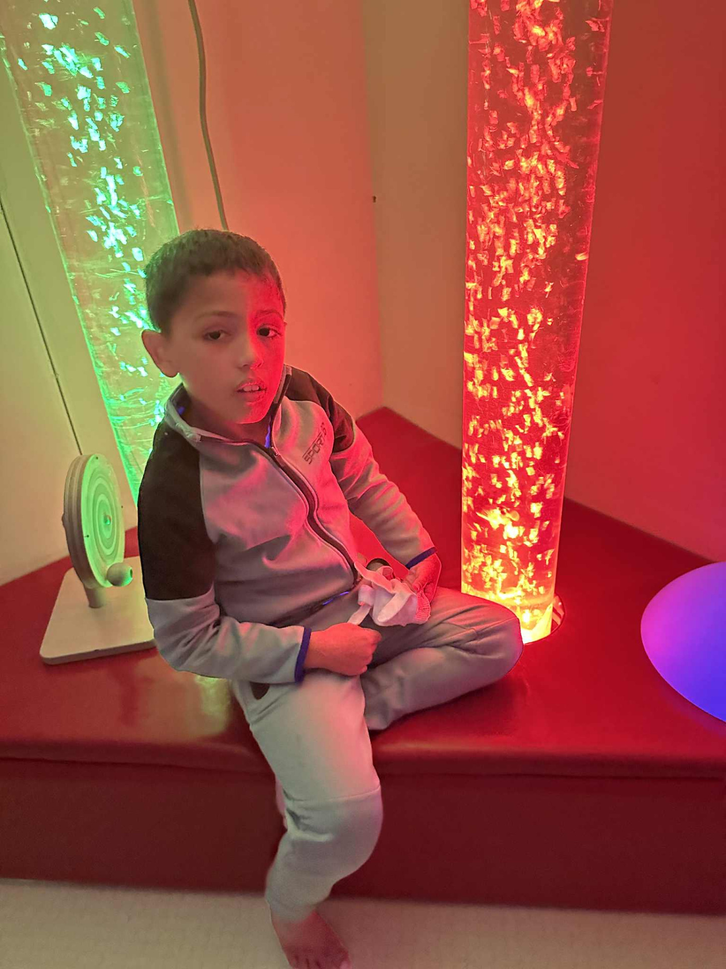 Régulièrement, les élèves de la classe profitent d'un moment d'exploration et de détente dans l'espace Snoezelen de l'école.